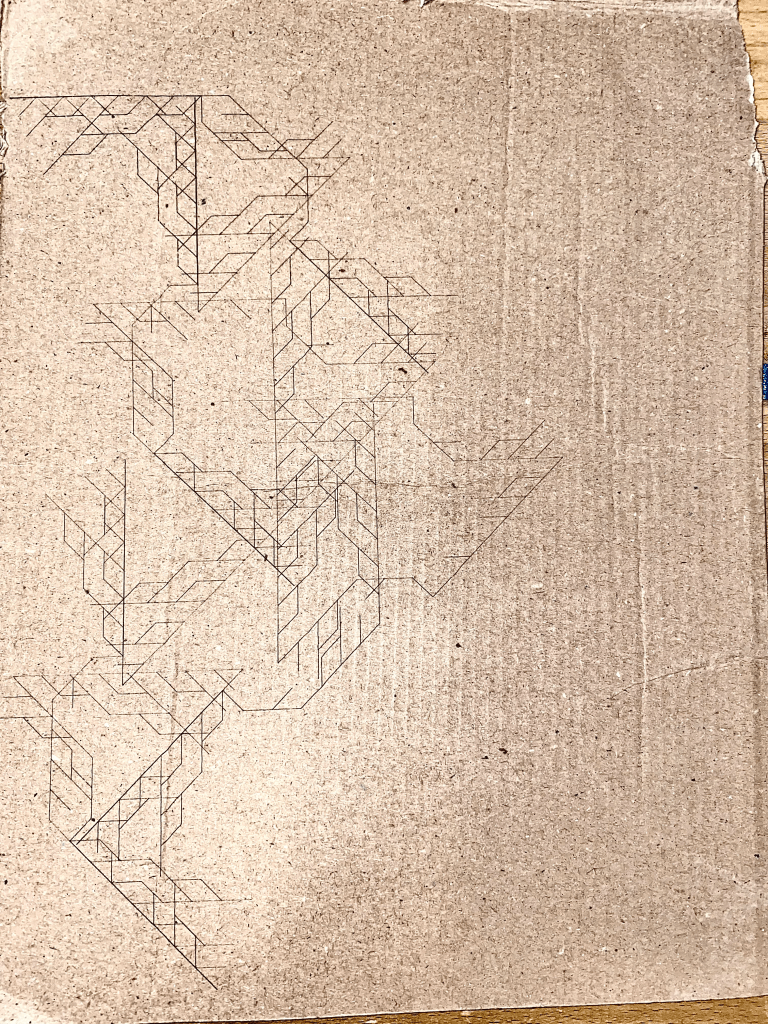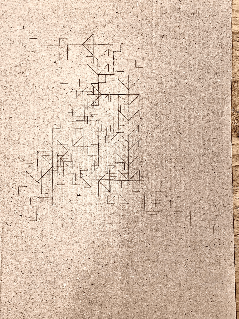 Though the initial plan was to use both vector etches and full cuts. After some review of the L-systems to be cut, I realized that much of the design would be lost due to the cuts removing a large portion of the vectors.