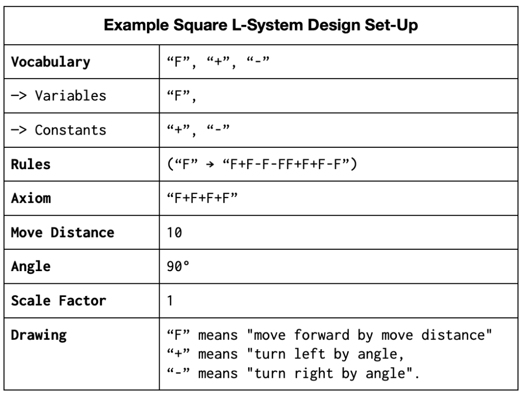 L-Systems originated from the observations of micro flora growth patterns. The patterns allowed for forms of symmetry and growth through the use of rules. The L-Systems used in this post will utilize two main parts: the vocabulary and the axiom. The vocabulary is the apparent commands and the rule on iteration involving them. The Axiom is the initial set of vocabulary that will grow the entire system.