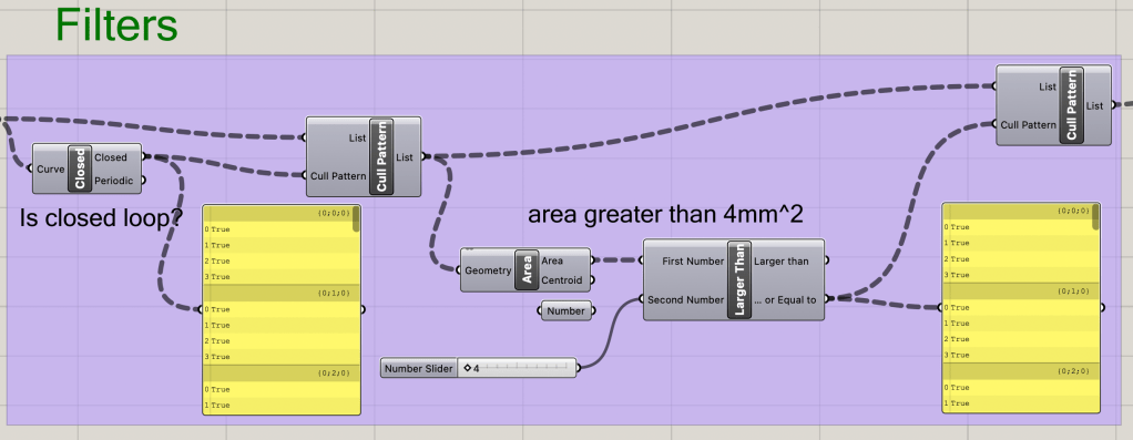 There are two filters utilized in this laser slicer. First the slices from the contour are inspected for being complete loops. Any incomplete loops are removed from the queue. A minimum area of the slices is set and any slices below that threshold are also removed.
