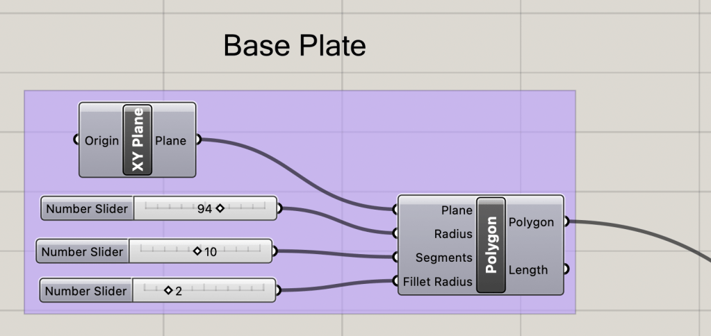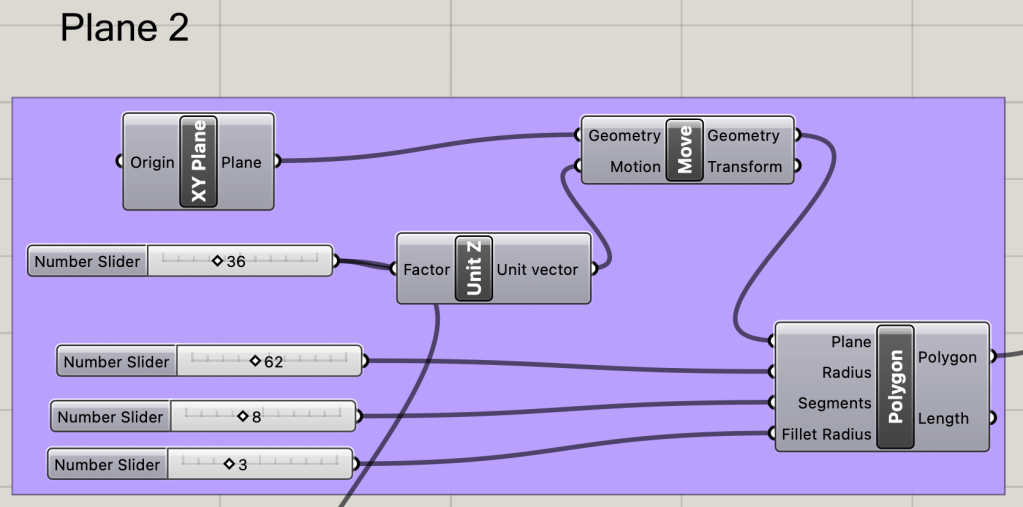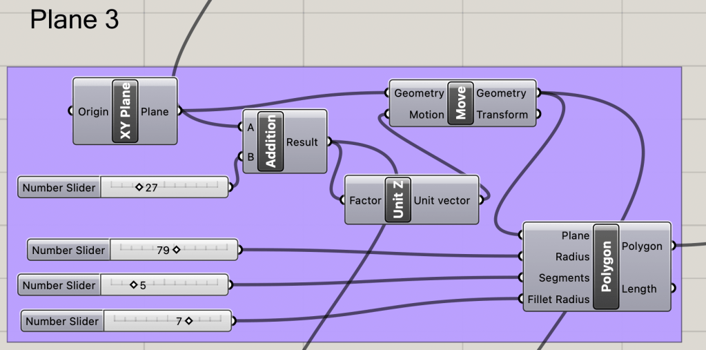 Each shape is aligned with the X-Y Plane, created as a polygon with a variable amount of sides that can be rounded if desired. The radius is also variable with another slider. The later planes will directly scale with the height of the previous, so there is no errors created if the middle section gets above the top section.