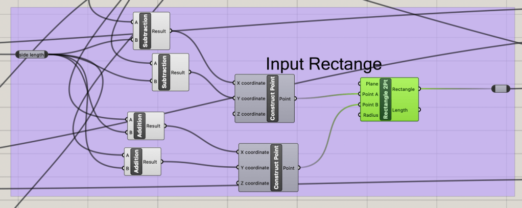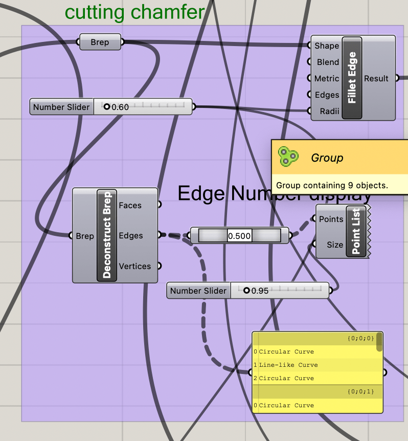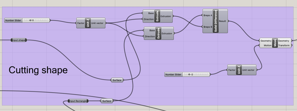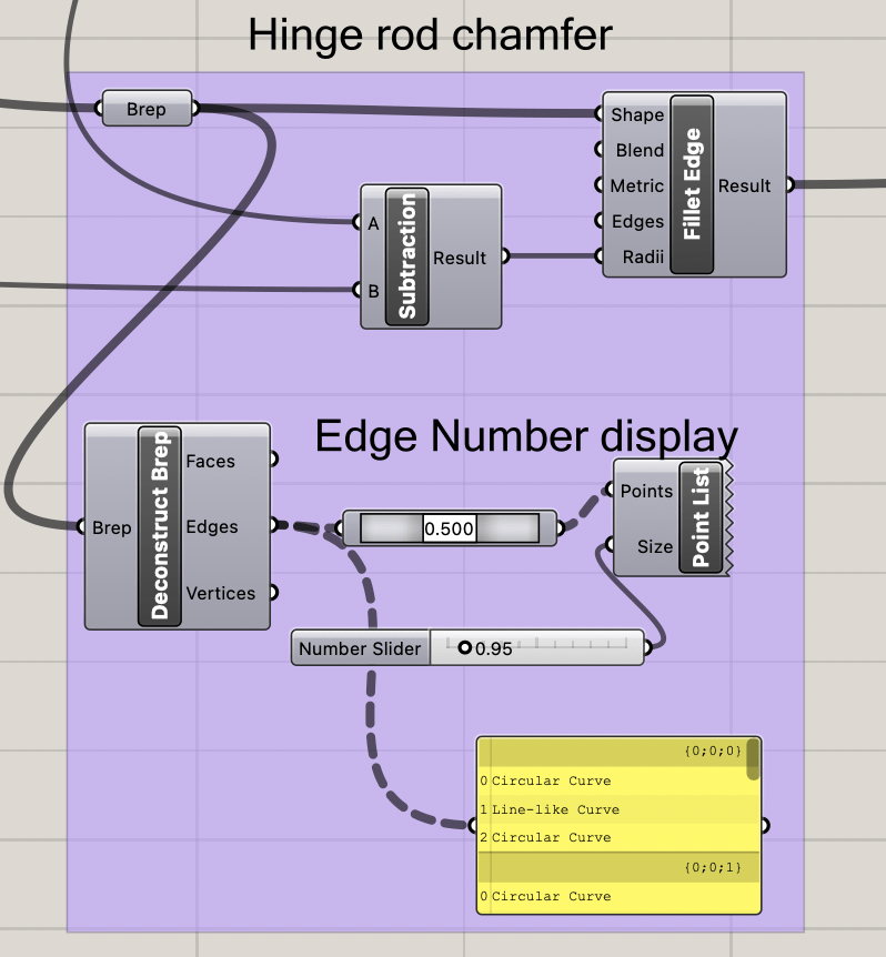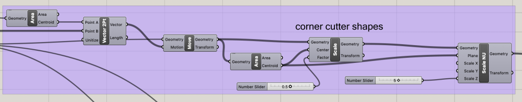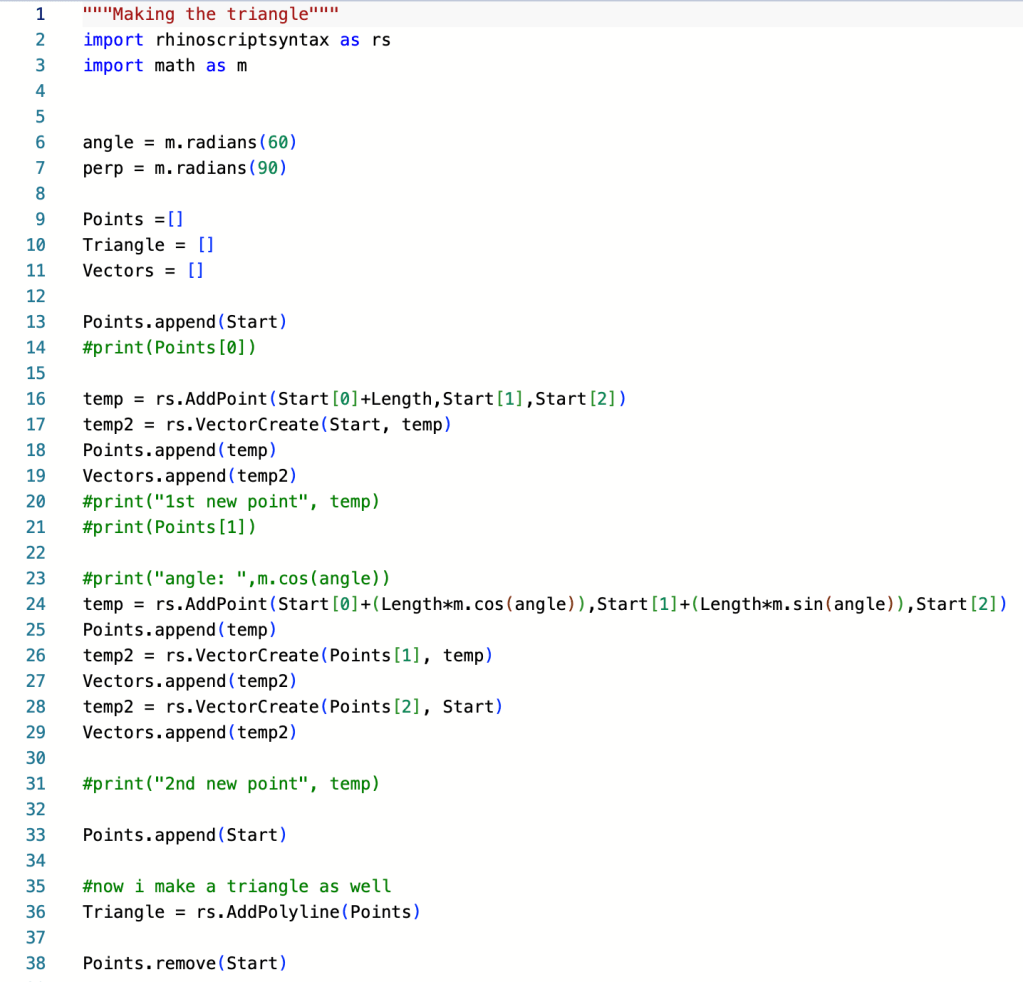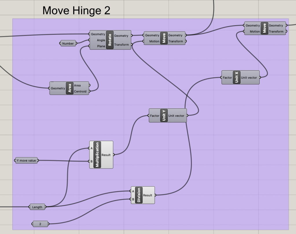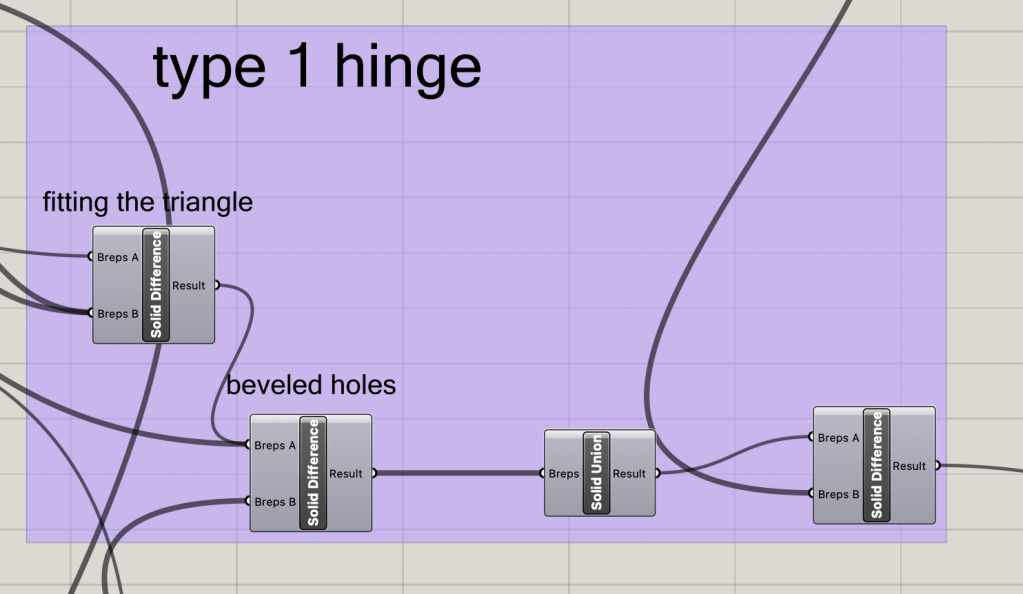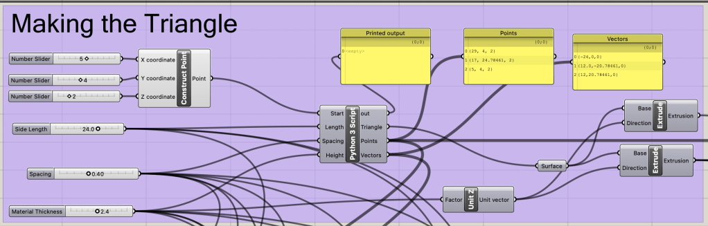 The base of the triangle is determined by the input sliders of thickness and side length. The python script is used to determine the correct placement of the hinges and the correct direction for each hinge extrusion.