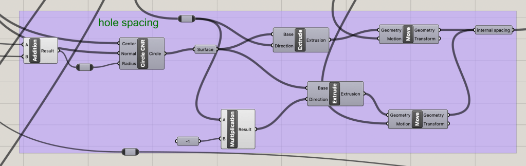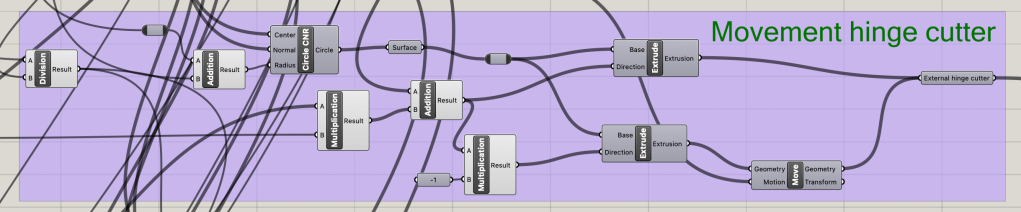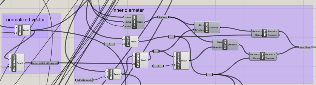 Though much of the design for the hinges is similar for each, there are slight differences to allow for a seamless fit when printed. Using the given points and vector direction as a base, the hinge parts can be spaced correctly when compared with the determined side length number. There are four cyliner needed to make the hinge: the external hinge base, the internal hinge base, themovement spacing and the hinge rod.