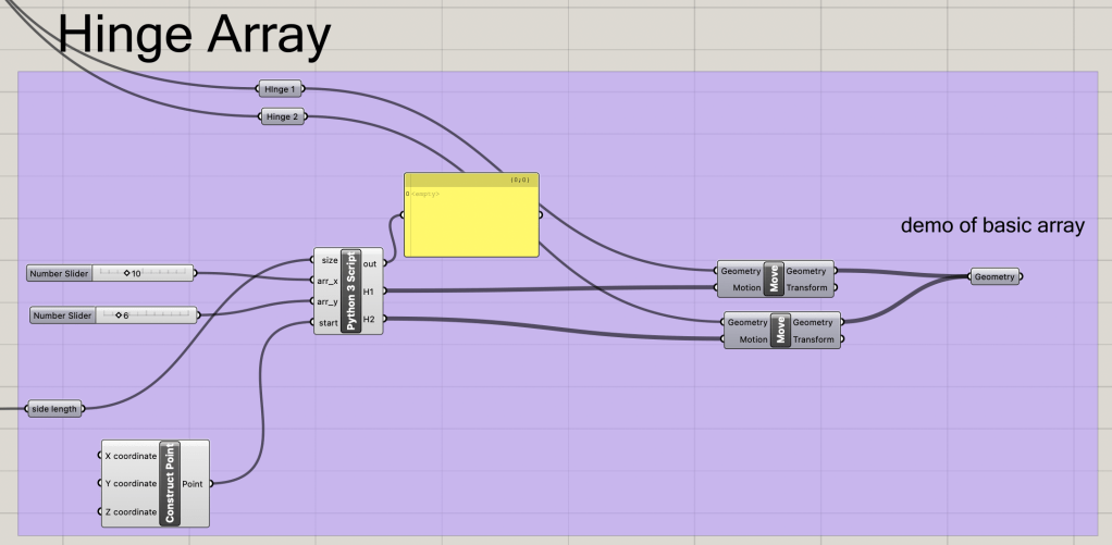 Using python simple geometry and planning ahead allows for most geometries to be created in rhino. There are just many auxiliary steps needed. My major complaint with the grasshopper system is how some data is formatted. All the hinges were in a pseudo list that I could not manipulate easily. This may be due to how external data from python is formatted in Grasshopper, but most four posts I read had similar issues with no really easy way to condense and consolidate.