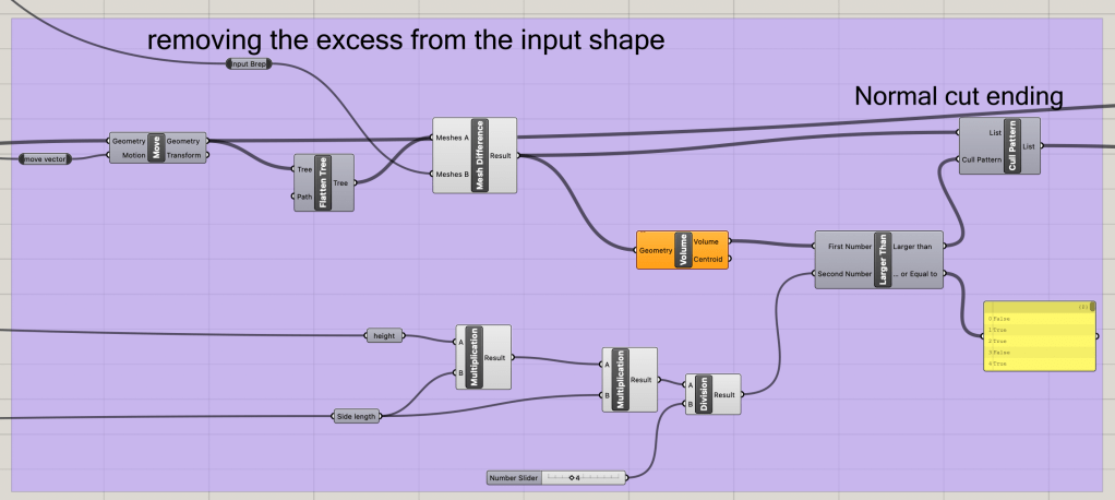 We can then take this cutting shape and create a mesh difference between the hinge array and cutting shape to leave a realistic imprint of the shape. The next step is to remove any minor part of the hinges that can’t really connect to anythign, or is too smal to actuall be there. This will. be done with a cull pattern and a volume comparison. Though this will make the hinges fit the shape slightly less, this would be a waste of material when the smaller parts fall off after being removed from the print bed.
