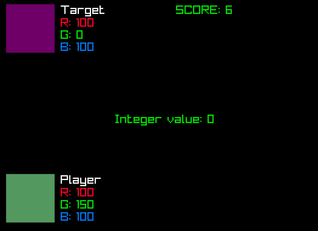 There are three main sections, the target, the player and the score. The target and player function similarly, a specific color is generated by the target and the player has to match all three of the RGB nodes to proceed to the next color. matching the color increases the score.